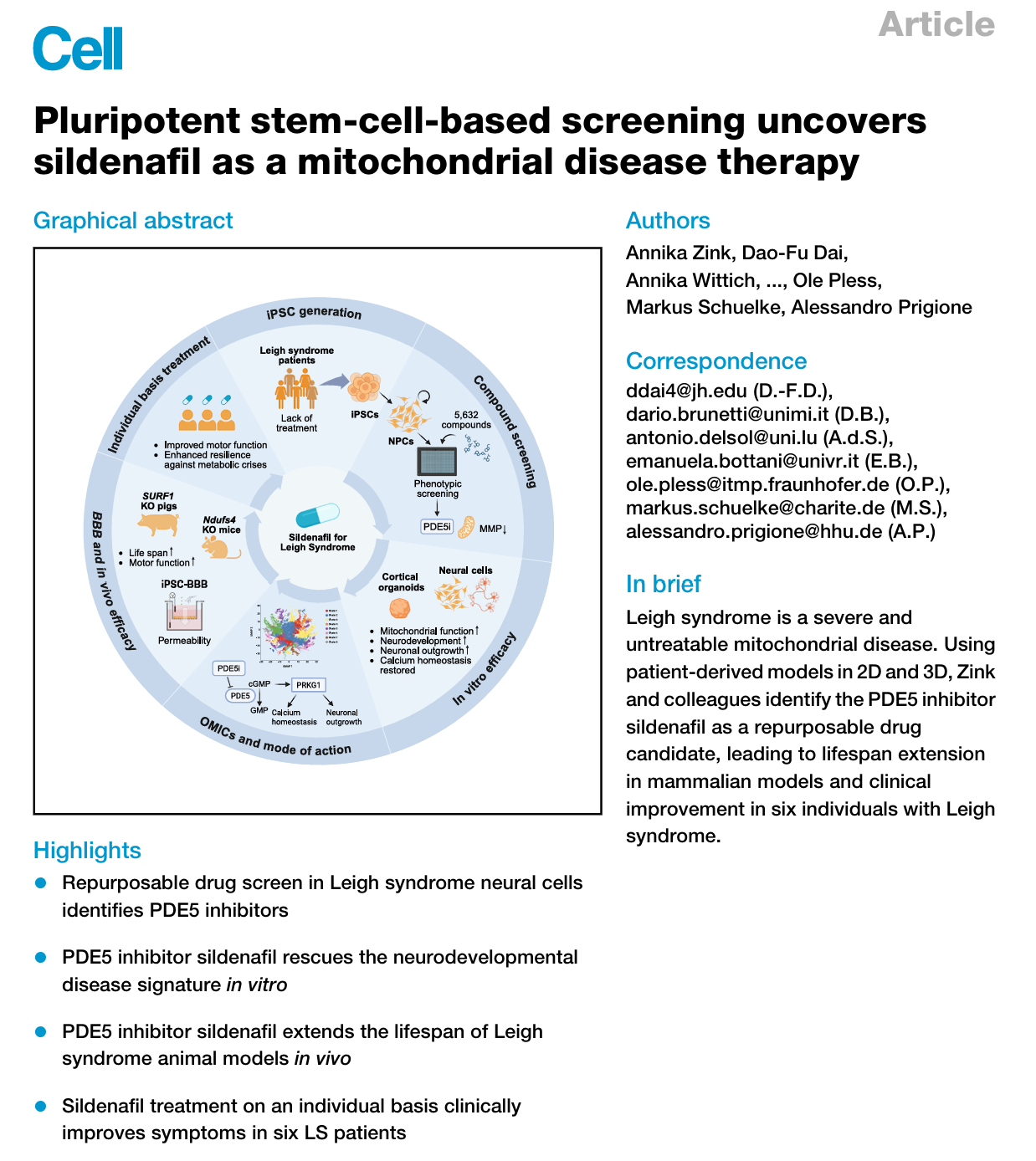 通过患者干细胞筛选发现西地那非能纠正线粒体异常、改善神经发育,延长疾病模型动物寿命,并在六例Leigh综合征患者中观察到运动与代谢功能的改善。
