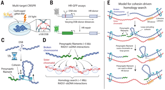 数据表明,黏连蛋白通过挤出断裂锚定的染色质环,很可能在HR过程中促进了同源性搜索,从而将DSB的染色体内扫描从一个3D问题转化为一个有序的1D过程。