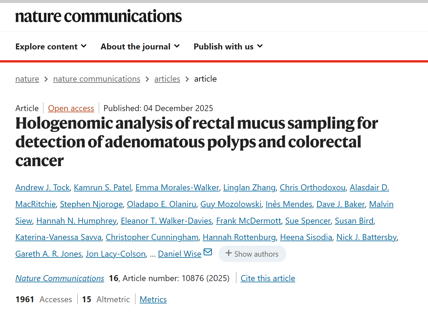 告别肠镜不适!Nat Commun重磅:直肠黏液+宏基因组解锁结直肠癌无创早筛新范式