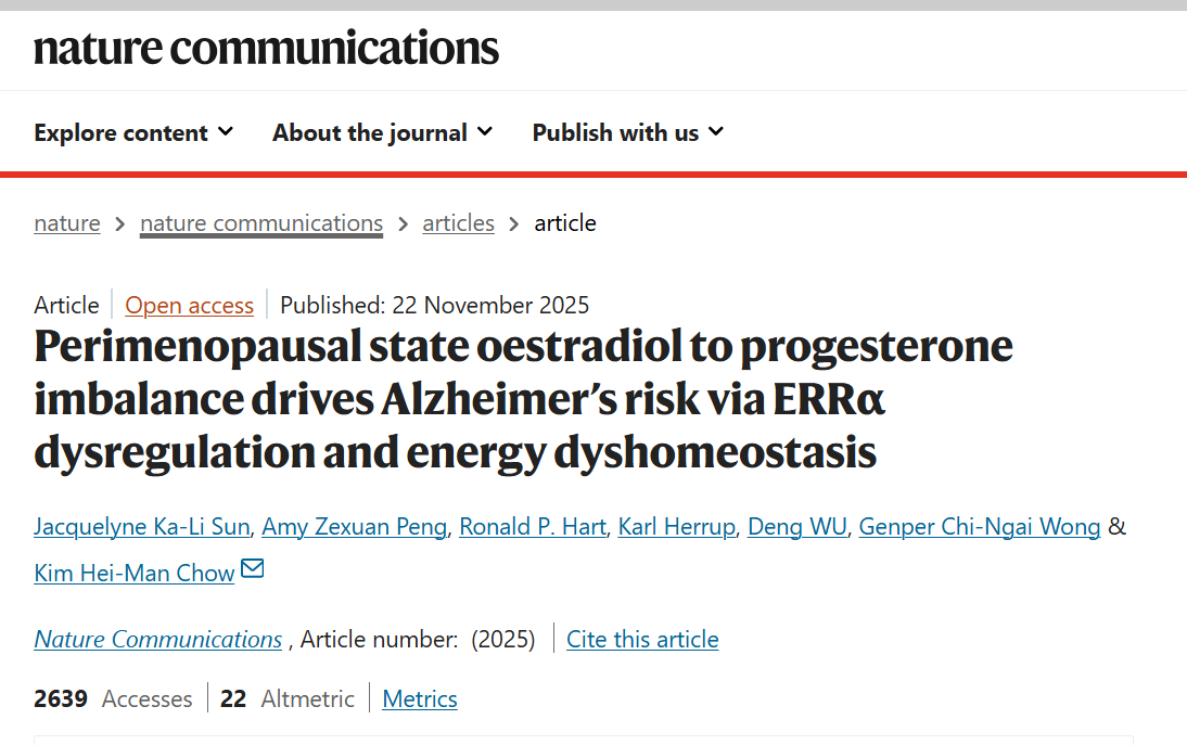 研究表明,围绝经期雌二醇升高、孕酮降低的失衡状态,通过扰乱ERRα信号及神经元胆固醇与能量稳态引发兴奋性毒性和认知障碍,增加阿尔茨海默病风险,补充天然孕酮可改善相关病理。