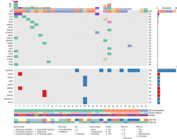 该试验是首个根据突变检测结果招募患者的全国性研究,并表示这项研究表明,为脑膜瘤患者开展基因组学驱动的试验是可行的,并且靶向治疗可能会改善具有特定基因突变患者的预后。